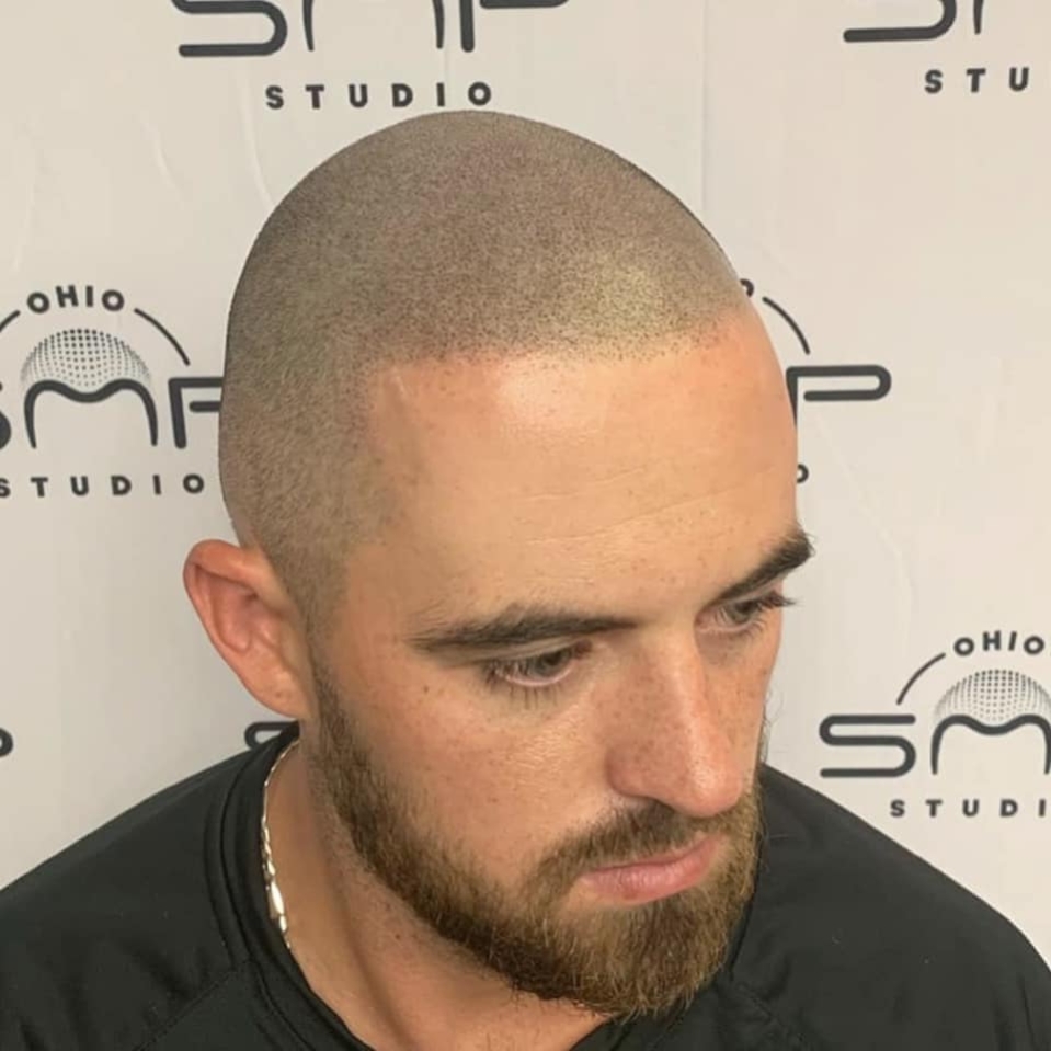 Our hair tattoo can cover all of your scalp if you are completely bald as it is very popular throughout Ohio. The hair tattoo procedure by Ohio SMP Studio can be used on parts of your scalp that are either receding, thinning, balding, or bald. A Scalp micro pigmentation expert, Clayton Rush can also camouflage scars using scalp pigmentation. At Ohio SMP Studio, Clayton Rush uses a microneedle to delicately tattoo a pigment into your scalp and a carefully planned out hair tattoo near Tiro Village OH. In this way, he gradually forms hair tattoos of specially pigmented (colored) hair follicles in the applied area of the scalp. As a result, you see a realistic impression of a full head of hair and a remarkable appearance. Call us at (419) 569-1630 to schedule a consultation with SMP expert Clayton Rush.