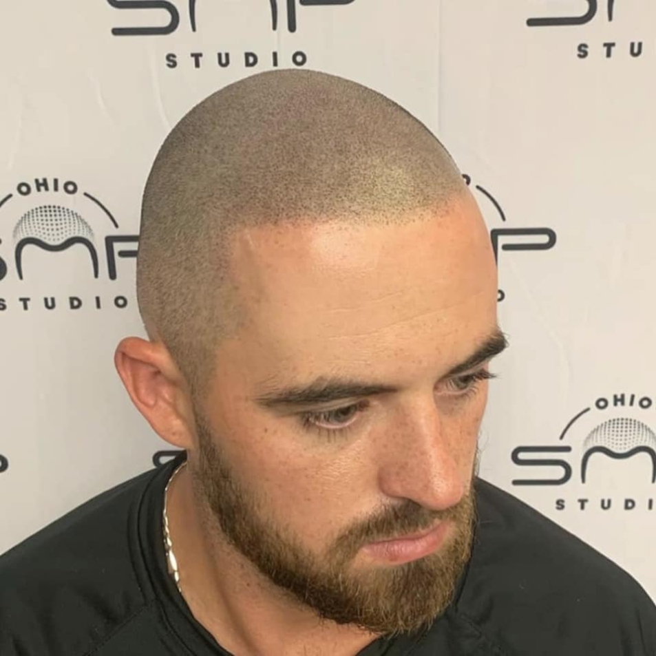 Our hair tattoo can cover all of your scalp if you are completely bald as it is very popular throughout Ohio. The hair tattoo procedure by Ohio SMP Studio can be used on parts of your scalp that are either receding, thinning, balding, or bald. A Scalp micro pigmentation expert, Clayton Rush can also camouflage scars using scalp pigmentation. At Ohio SMP Studio, Clayton Rush uses a microneedle to delicately tattoo a pigment into your scalp and a carefully planned out hair tattoo near Waterford OH. In this way, he gradually forms hair tattoos of specially pigmented (colored) hair follicles in the applied area of the scalp. As a result, you see a realistic impression of a full head of hair and a remarkable appearance. Call us at (419) 569-1630 to schedule a consultation with SMP expert Clayton Rush.